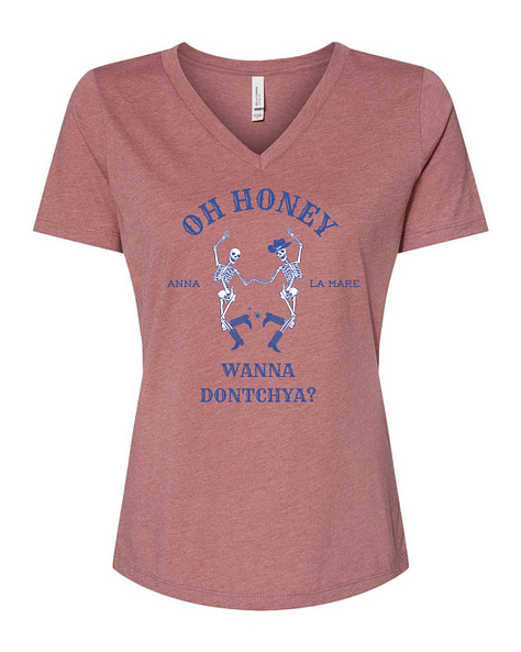 ”Oh Honey Wanna Dontchya” v-neck women’s tee , dusty rose = $40