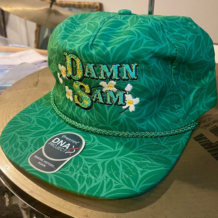 ”Damn Sam” hand stitched flatbill cap = $50