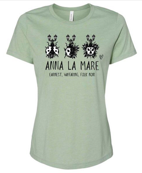 ”Anna La Mare” ladybug sunflower lightpost tee, sage = $40